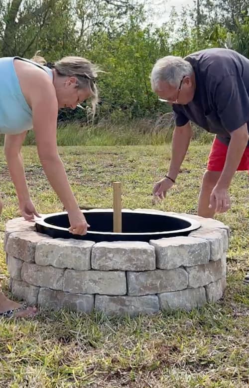 Once the first layer was finished, we removed the ring and laid the next layer and staggered the bricks. Then, we put the fire pit ring back in, just to make sure it had the right round shape, in case it needed any adjustments.