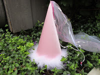 6. Take your hot glue gun and create the cone. Take some masking tape and tape along the seam on the inside, just for additional strength. **Note: When I did it, I left a little opening at the tip of the hat, so I could feed the ribbon and tulle through it later.