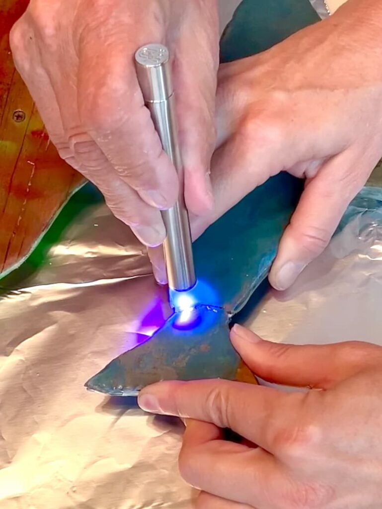 I held it together, while Greg used the UV light to harden it. It’s quick to harden and give you a good strong bond. I repeated it on the back of the break too.