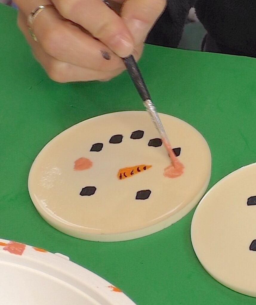 When cured, remove the coasters from the mold. And now it’s time to take the white discs and turn them into a fun snowman craft.