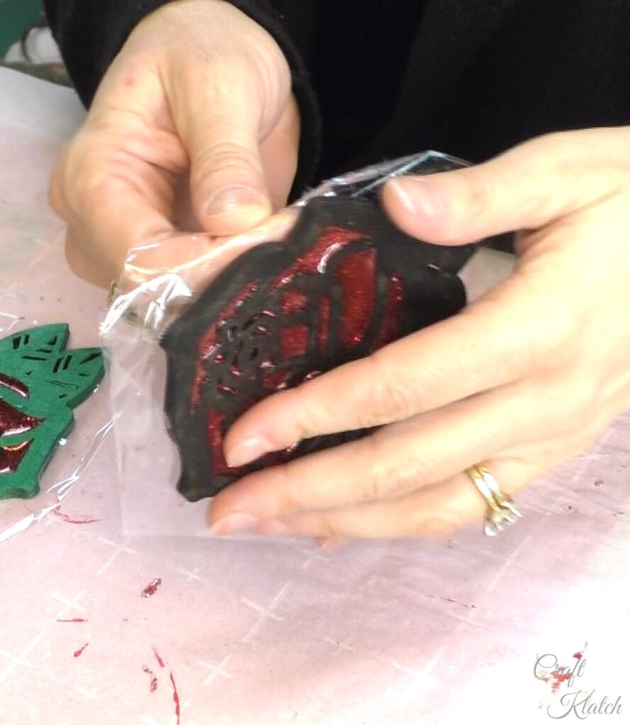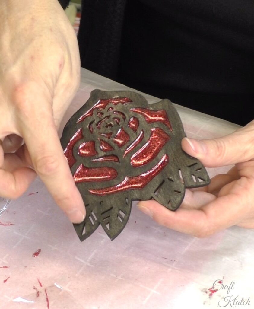 Drip red glitter resin into the wood rose coaster